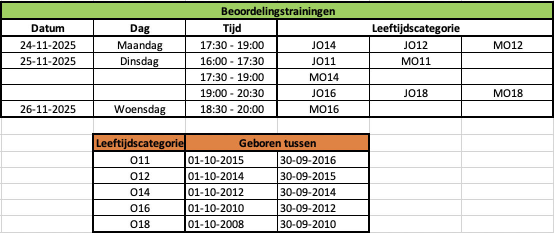 In de bijlage (afbeelding) vind je de tijden van de beoordelingstrainingen per leeftijdscategorie. Controleer goed in welke categorie een speler of speelster valt.